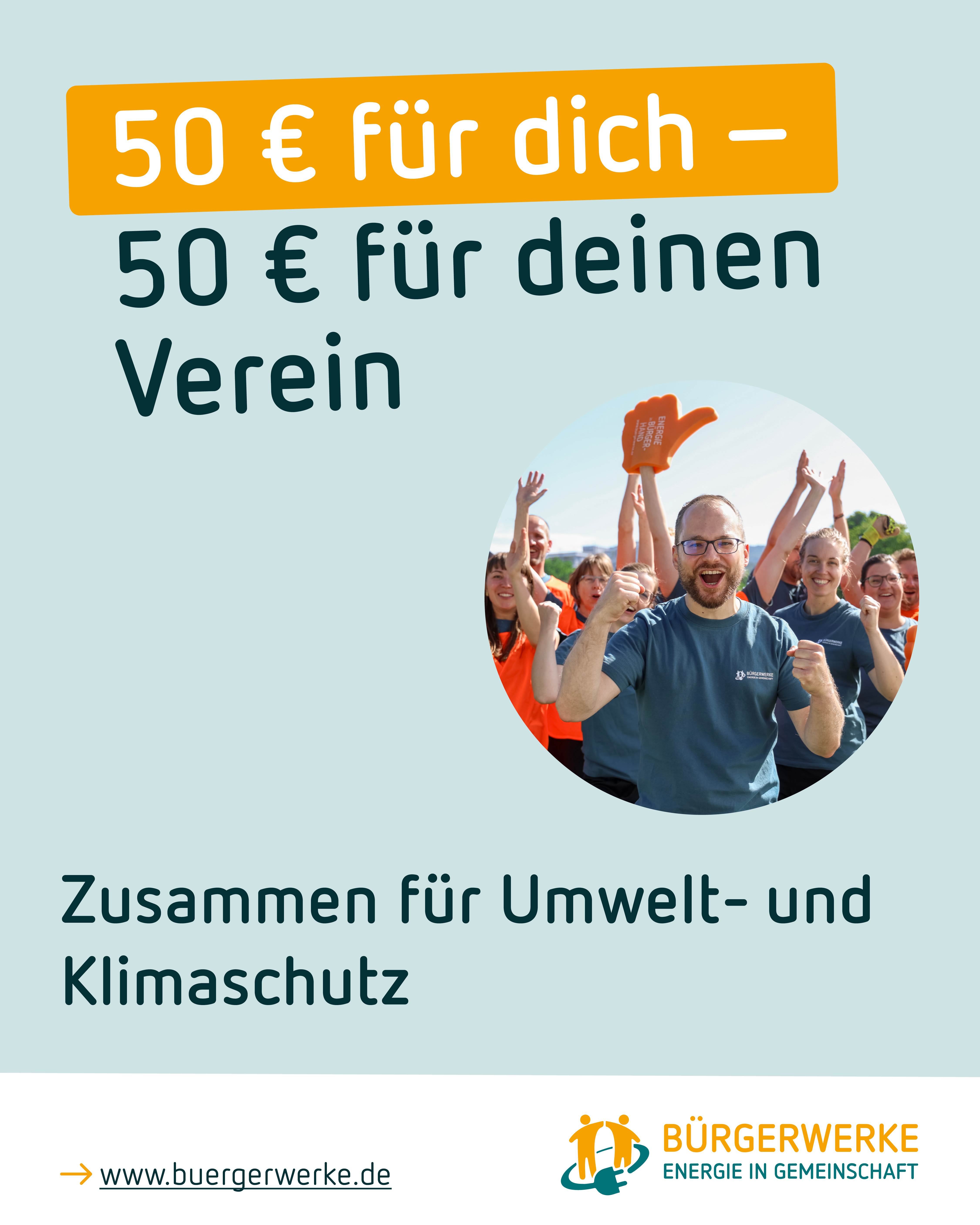 Vereine erhalten einen Aktionscode, wenn sie sich im Aktionsverteiler registrieren. Für jeden Stromwechsel zu den Bürgerwerken im Aktionszeitraum erhält der Verein 50 € in die Vereinskasse. Und auch die wechselnde Person, die den Aktionscode des Vereins angibt, erhält 50 € als Dankeschön.